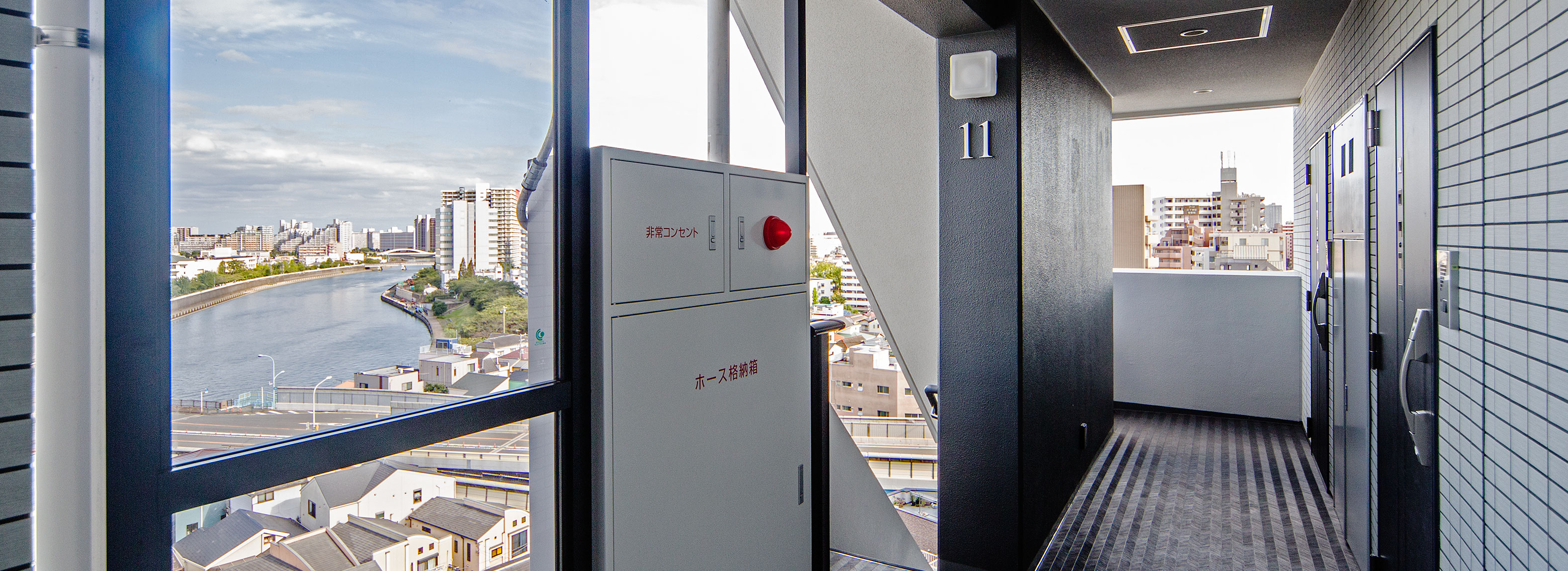 ご購入いただいたLEXE OJI-KAMIYAの共用廊下。階下に隅田川が臨める。